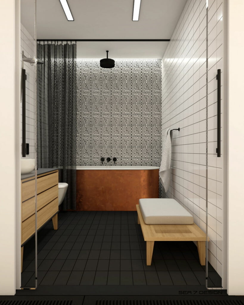 Aesthetic of the interior was inspired by minimalistic climate of black and white photography and naval architecture.