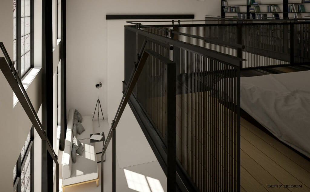 Openwork bridges, steps and railings correspond with a ship. A translucent edge of a mezzanine and a balustrade give it a lightness and at the same time allows to keep intimacy in a private part of the apartment, where were placed a bedroom and a bathroom.