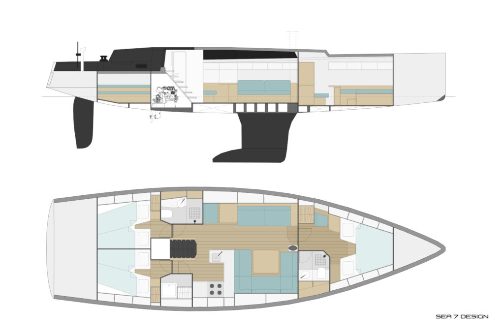 The interior layout features three double cabins. The master cabin positioned forward with its own head and shower compartment and a desk. Two double cabins with single berhts are located in the aft.